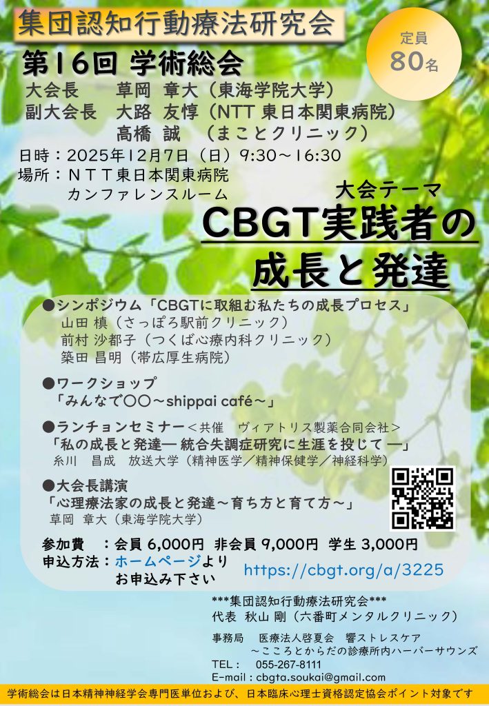 第16回集団認知行動療法研究会学術総会「CBGT実践者の成長と発達」のご案内